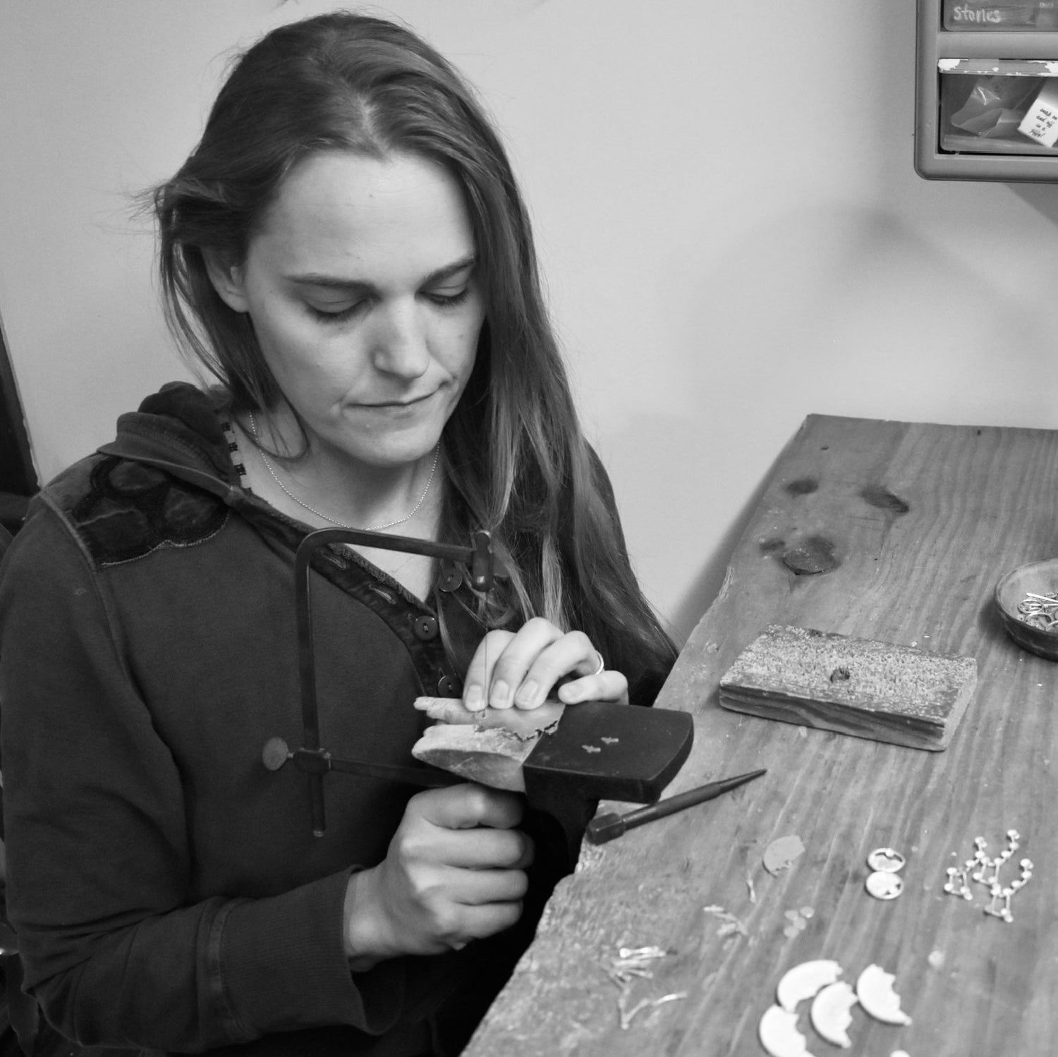 Every piece begins as a design I create by hand in my Richmond, Virginia studio. I work with ethically sourced or recycled metals, cutting, texturing, and layering each element to bring the design to life.