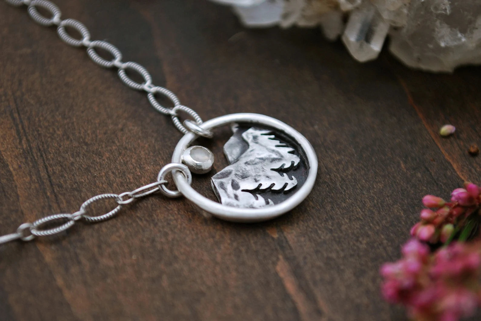 Carry a little mountain with you wherever you go. This charm-sized silver landscape captures layered peaks in a delicate, everyday necklace. Lightweight and framed for comfort, it’s a small reminder of adventure and wide-open skies.