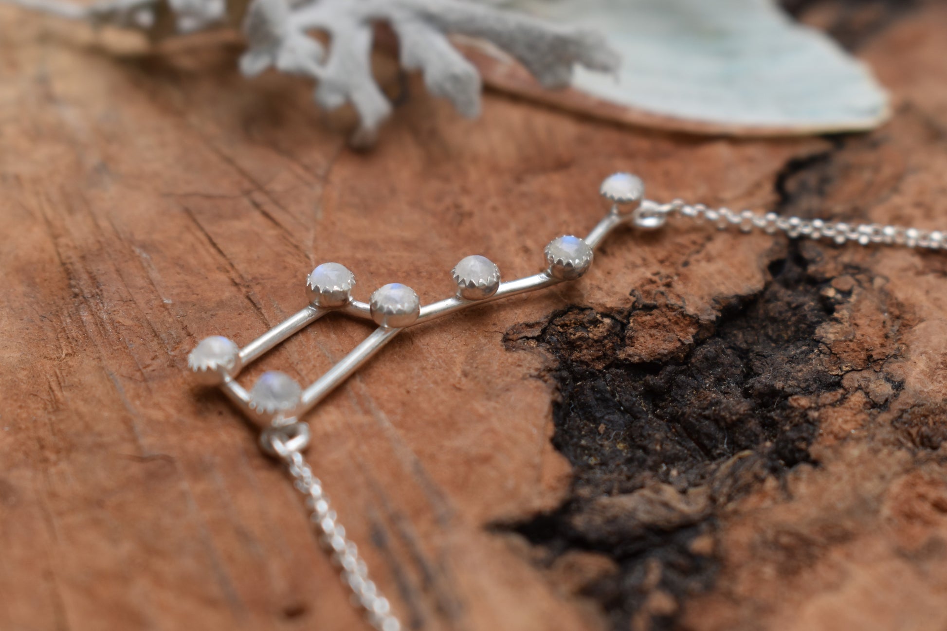 Carry the night sky with you wherever you go. This silver constellation necklace features the Big Dipper accented with natural rainbow moonstone stars. At this size they look very similar to regular moonstones but with a little something extra. The beautifully subtle color that flash at different angles, mainly blues with some hints of warmth, is the perfect ethereal beauty for a constellation.
