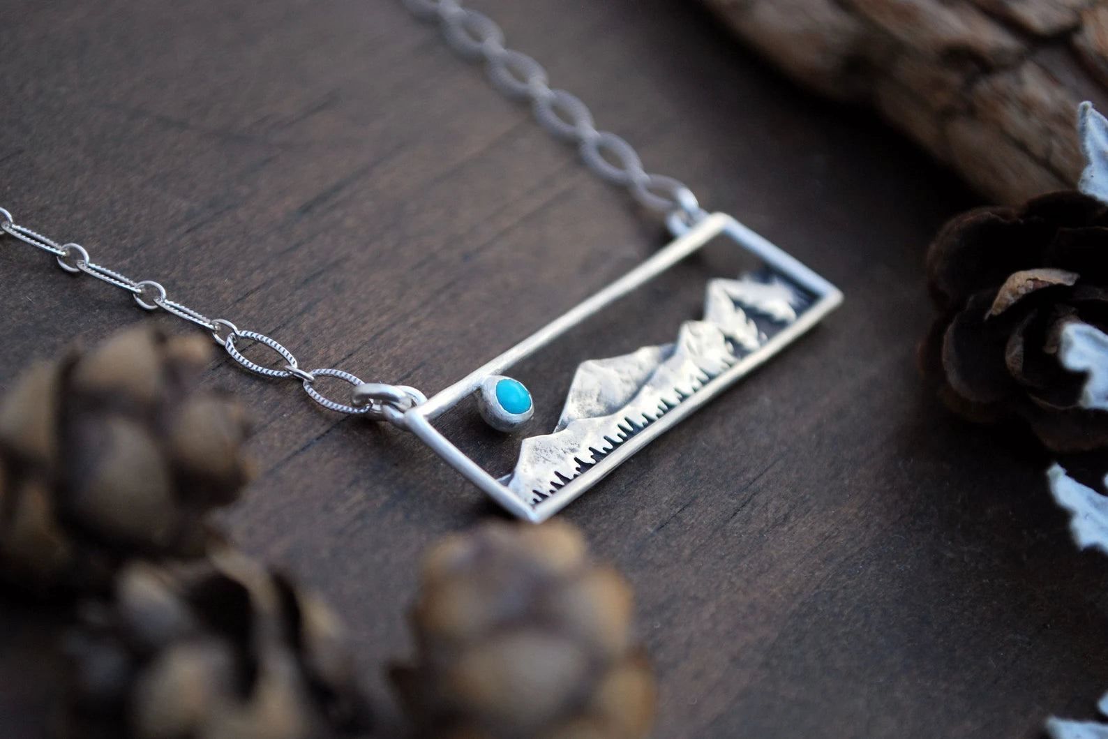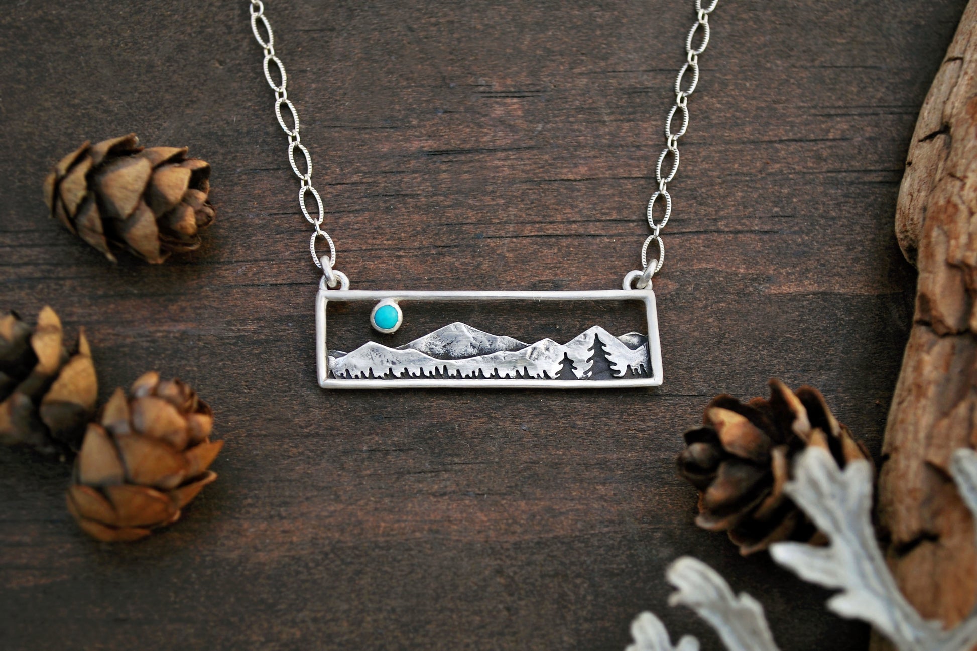 Carry a little landscape with you wherever you go. This necklace captures an intricate mountain and pine forest scene framed like a window into the valley—perfect as an everyday reminder of the places that feel like home.