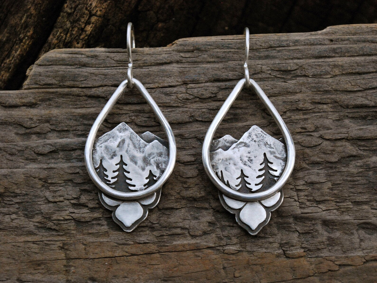 Boho silver mountain pine teardrop earrings that go with anything! Big enough to add some flair and light enough to wear all day. Full of organic details with intricate mountain textures and mirrored left/right designs for a balanced, natural pair.