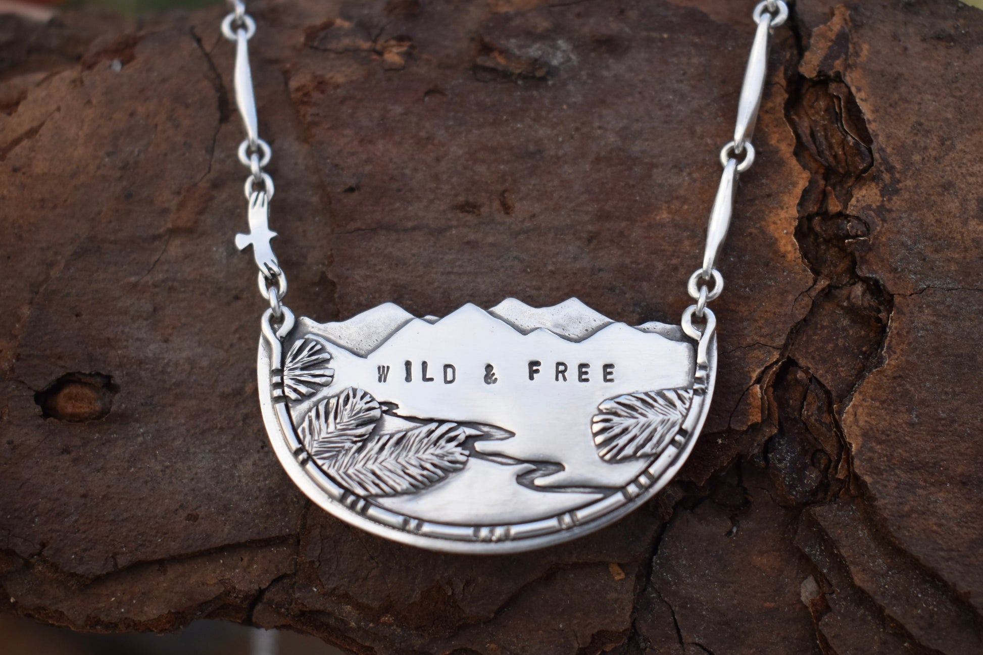 The back reveals a smooth mountain valley peeking through pine branches, with WILD & FREE stamped above the wriggling waterway. A notched border ties into the pendant’s quiet, linear motif.