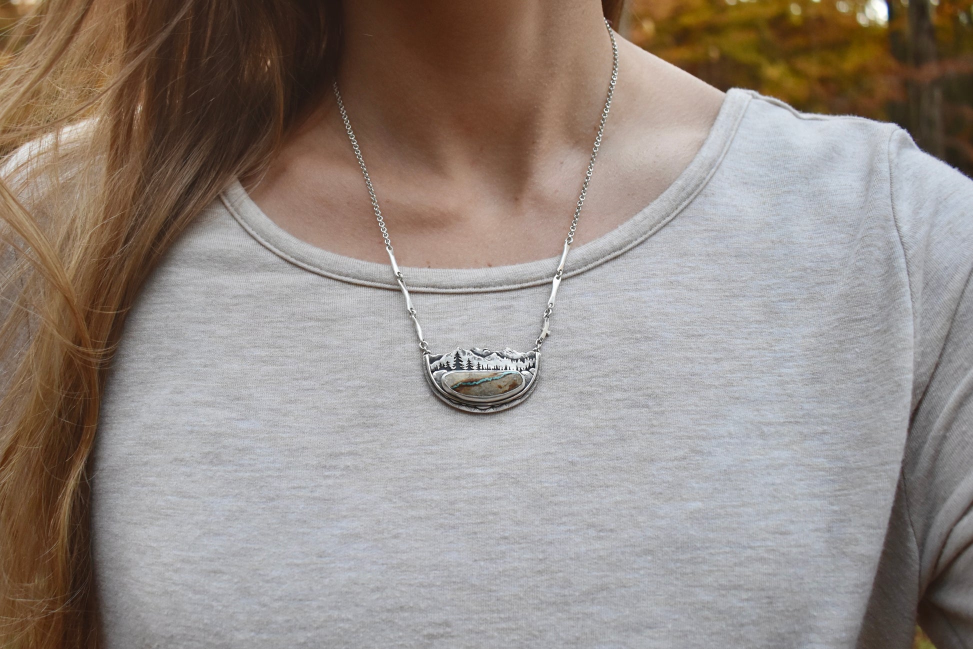 Pine Creek features a Royston Ribbon turquoise with a defined line of blue, echoing a steep, narrow creek. The stone is set in fine silver among smooth, rounded stones, with crisp silhouetted pines rising above. The half-circle pendant balances geometric structure with organic details, framed by pebble-like scallops and clean, fine rays.